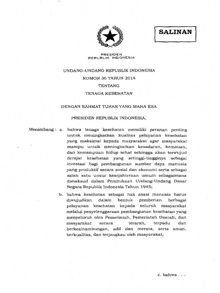 Republik indonesia undang undang no. Undang undang republik indonesia nomor 36 tahun 2014 tentang tenaga kesehatan dengan rahmat tuhan yang maha esa presiden republik indonesia menimbang. 2 ketentuan mengenai kualifikasi minimum sebagaimana dimaksud pada ayat 1 diatur dengan.