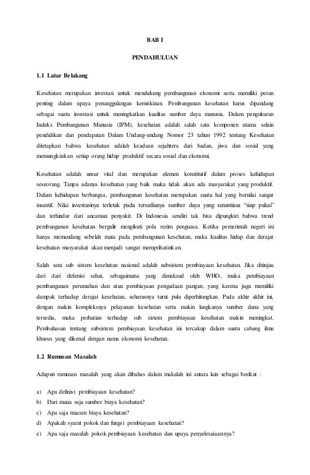 Sistem pembiayaan kesehatan di indonesia yang berlaku saat ini adalah jaminan kesehatan nasional yang dimulai pada tahun 2014 yang secara bertahap menuju ke universal health coverage. Skd menguraikan secara spesifik unsur unsur upaya kesehatan pembiayaan kesehatan sumber daya manusia kesehatan sumber daya obat dan perbekalan kesehatan pemberdayaan masyarakat dan manajemen kesehatan sesuai dengan potensi dan kondisi daerah. Delfi lucy stefani f1d2 11035 jurusan kesehatan masyarakat fakultas kesehatan masyarakat universitas haluoleo kendari 2013 bab i pendahuluan 11 latar belakang kesehatan merupakan investasi untuk mendukung pembangunan ekonomi serta memiliki peran penting dalam upaya penanggulangan kemiskinan.